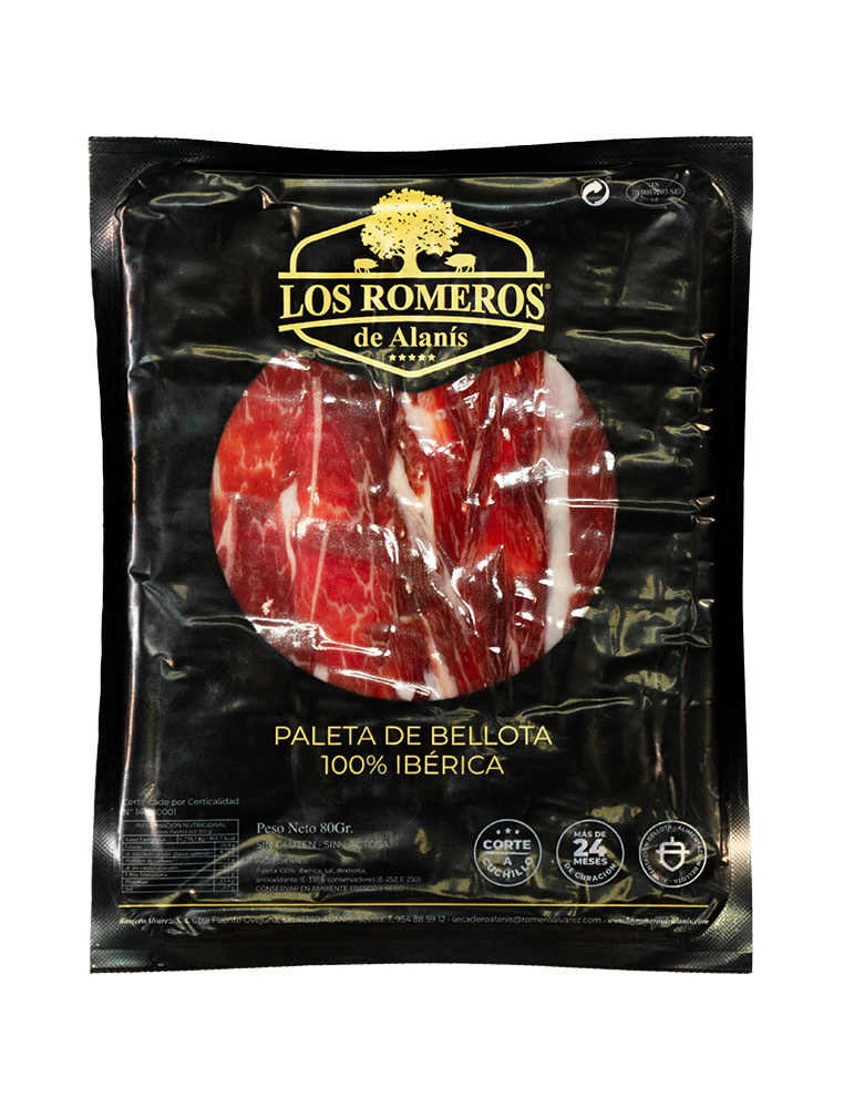 Descubre el auténtico sabor de España con nuestra Paleta de Bellota 100% Ibérica, una joya de la gastronomía española. Esta paleta proviene de cerdos ibéricos criados en libertad en las dehesas, alimentados exclusivamente con bellotas durante la montanera. El resultado es un producto de calidad excepcional, con una carne de textura jugosa, infiltración de grasa que se funde en boca, y un sabor intenso con notas dulces y de frutos secos. Cada loncha es una experiencia única, que te transporta a la tradición y el saber hacer de los maestros jamoneros.